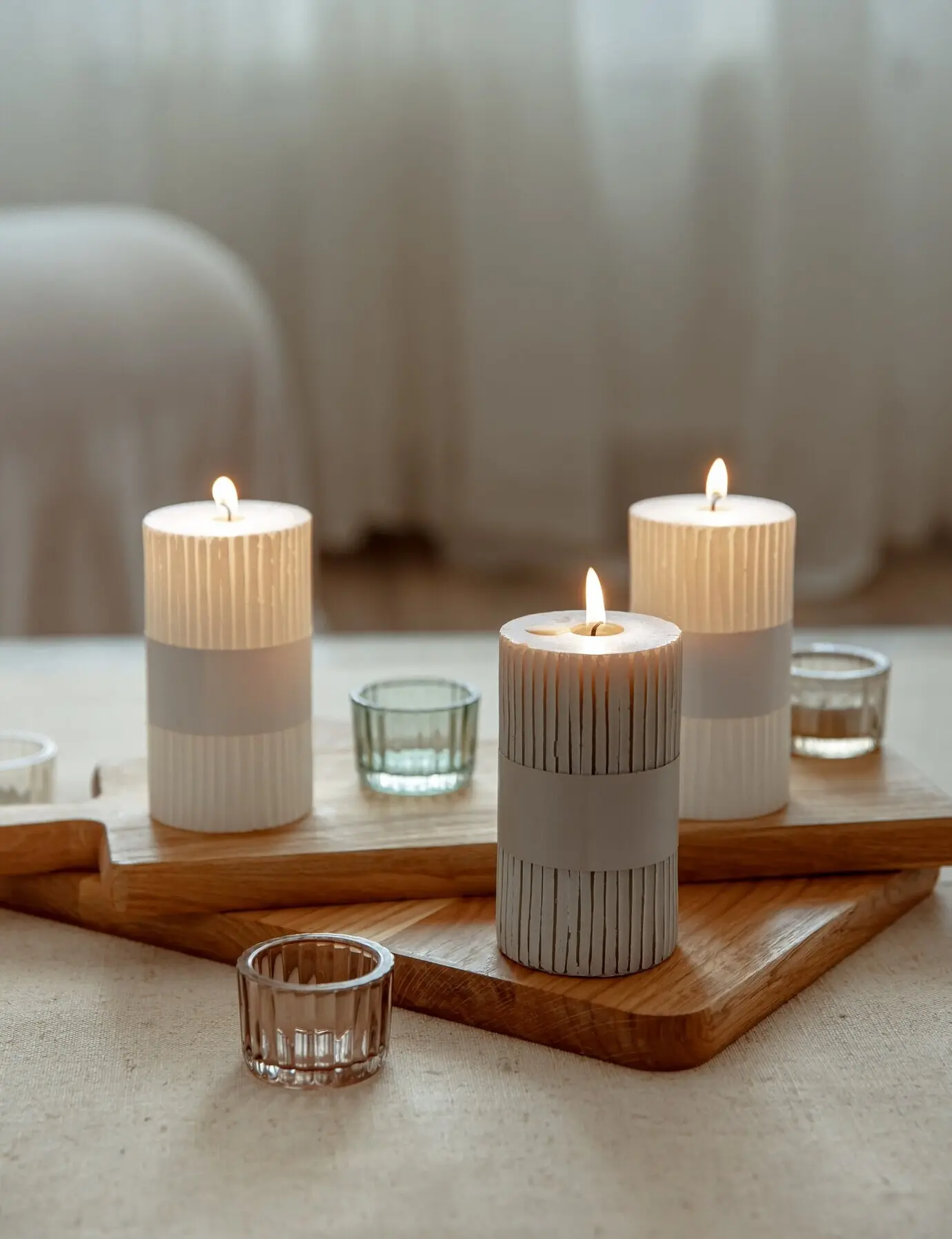 Setze warme Metalle, weiche Textilien und sanfte Glühpunkte mit Gewürz- oder Bernsteinakzenten in Beziehung. Eine Hauptkerze auf dem Couchtisch darf Charakter zeigen, wird aber von zwei zurückhaltenden Flankendüften an Sideboard und Fenster unterstützt. So entsteht ein resonanter Rahmen ohne Duftwucht. Bleibe farblich kohärent: Messing, gedämpftes Rotbraun und Terrakotta harmonieren mit Vanille, Kardamom und weichem Rauch. Für Abende mit Gästen intensität drosseln, lieber später kurz auffrischen. Gespräche bleiben lebendig, niemand wird ermüdet, und der Raum wirkt einladend statt parfümiert.